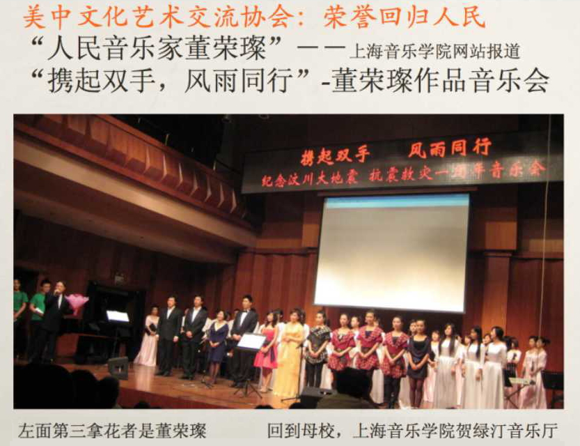 - “董荣璨是一位钢琴家、作曲家、艺术家、制作人、社会活动家、爱心慈善家、美中文化交流大使” --(选自三门峡电视新闻联播 2013.5.10)